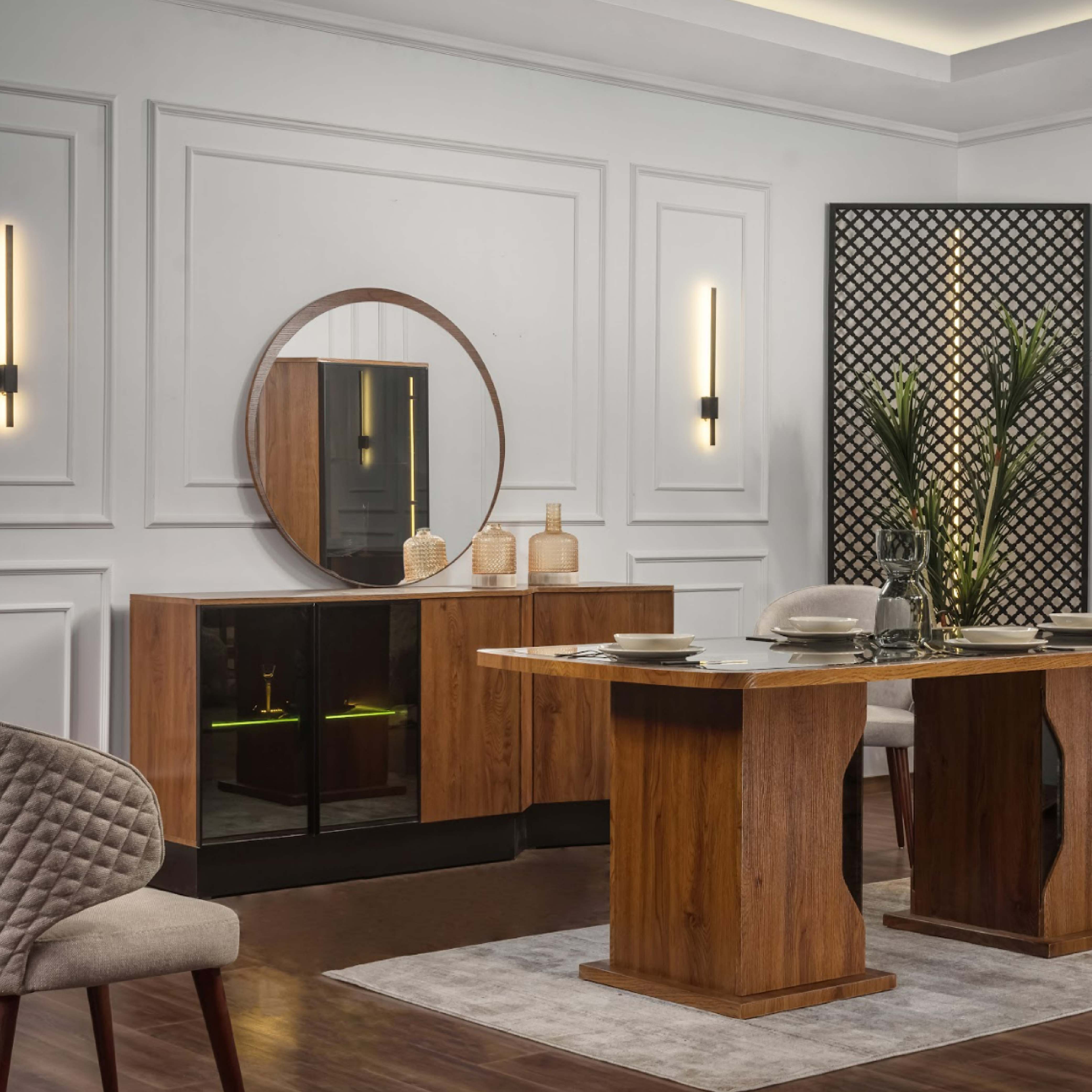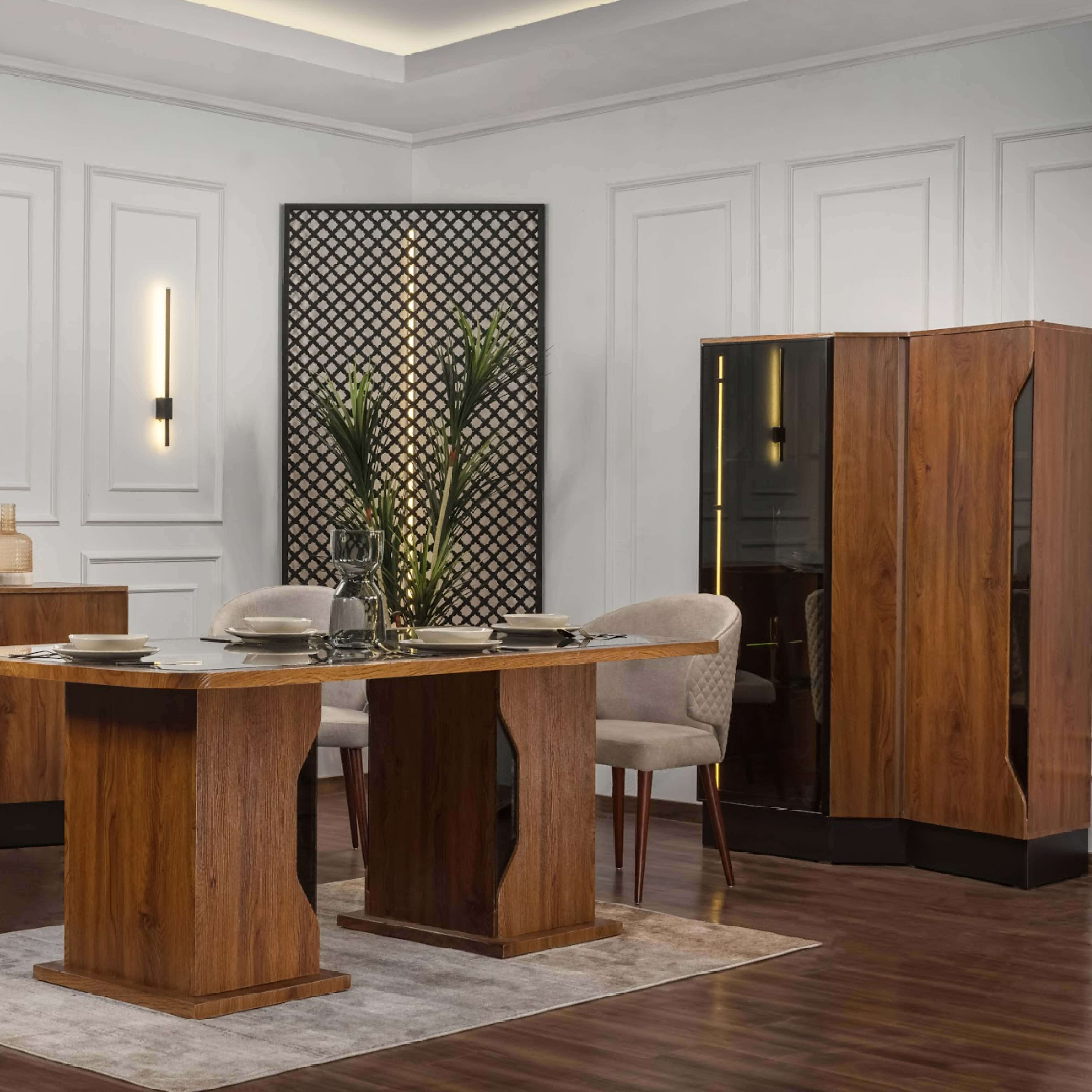 سفرة مكونة من ترابيزة + 6 كراسي + نيش + بوفيه مسطحات الغرفة خشب ام دي اف كراسي السفرة خشب زان احمر