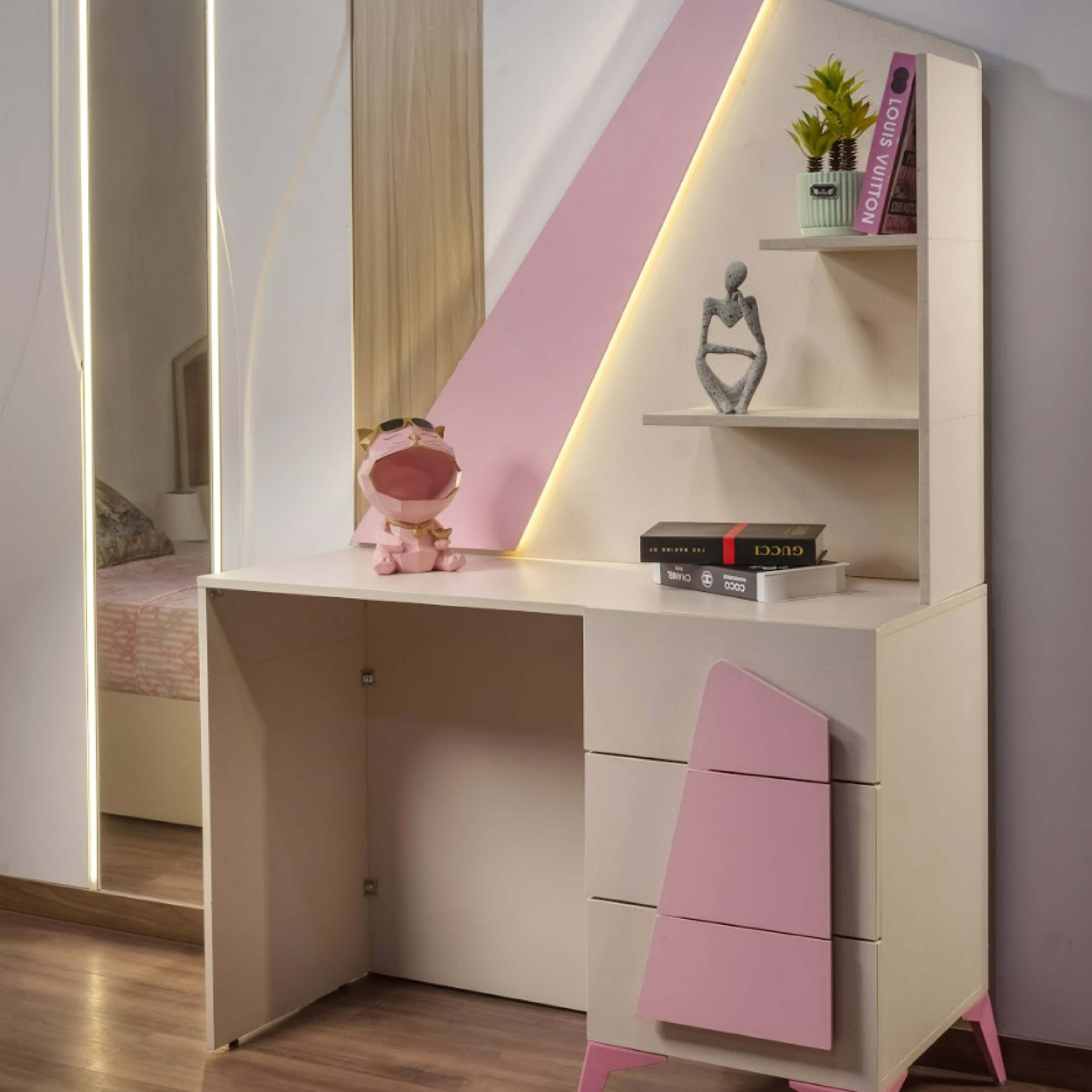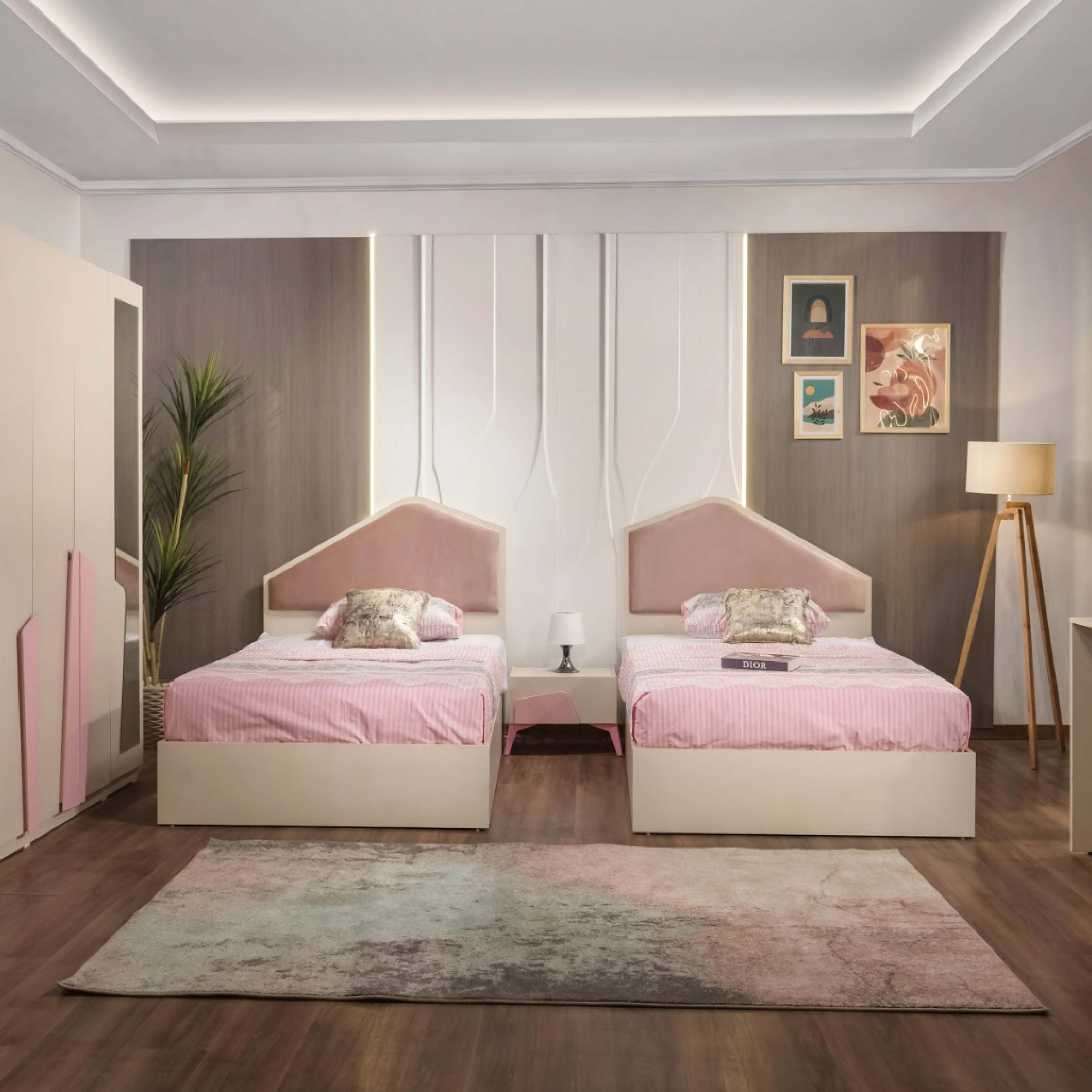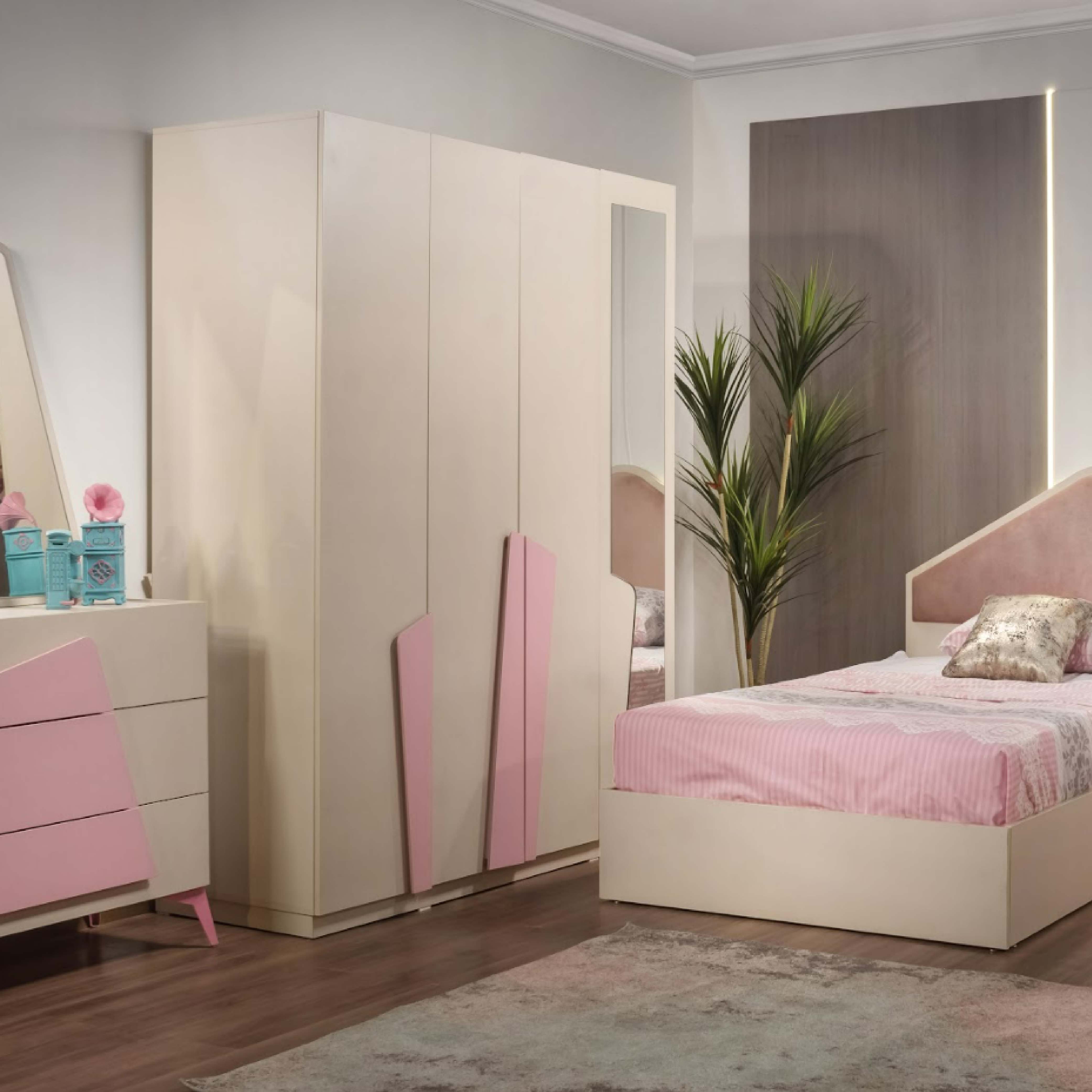 غرفة نوم اطفال مكونة من 2 سرير + 1 كمود + تسريحة + دولاب خشب ام دي اف + مكتب