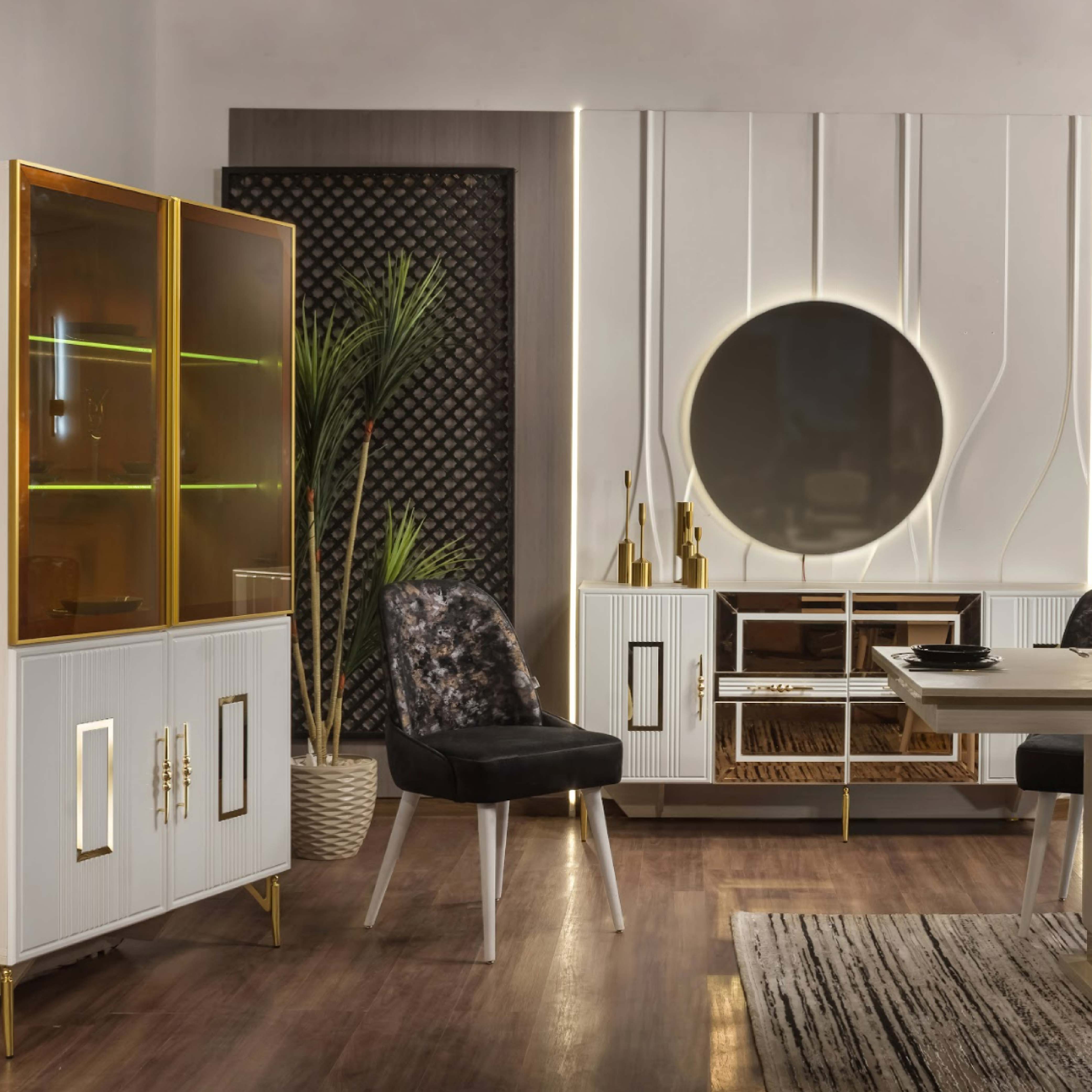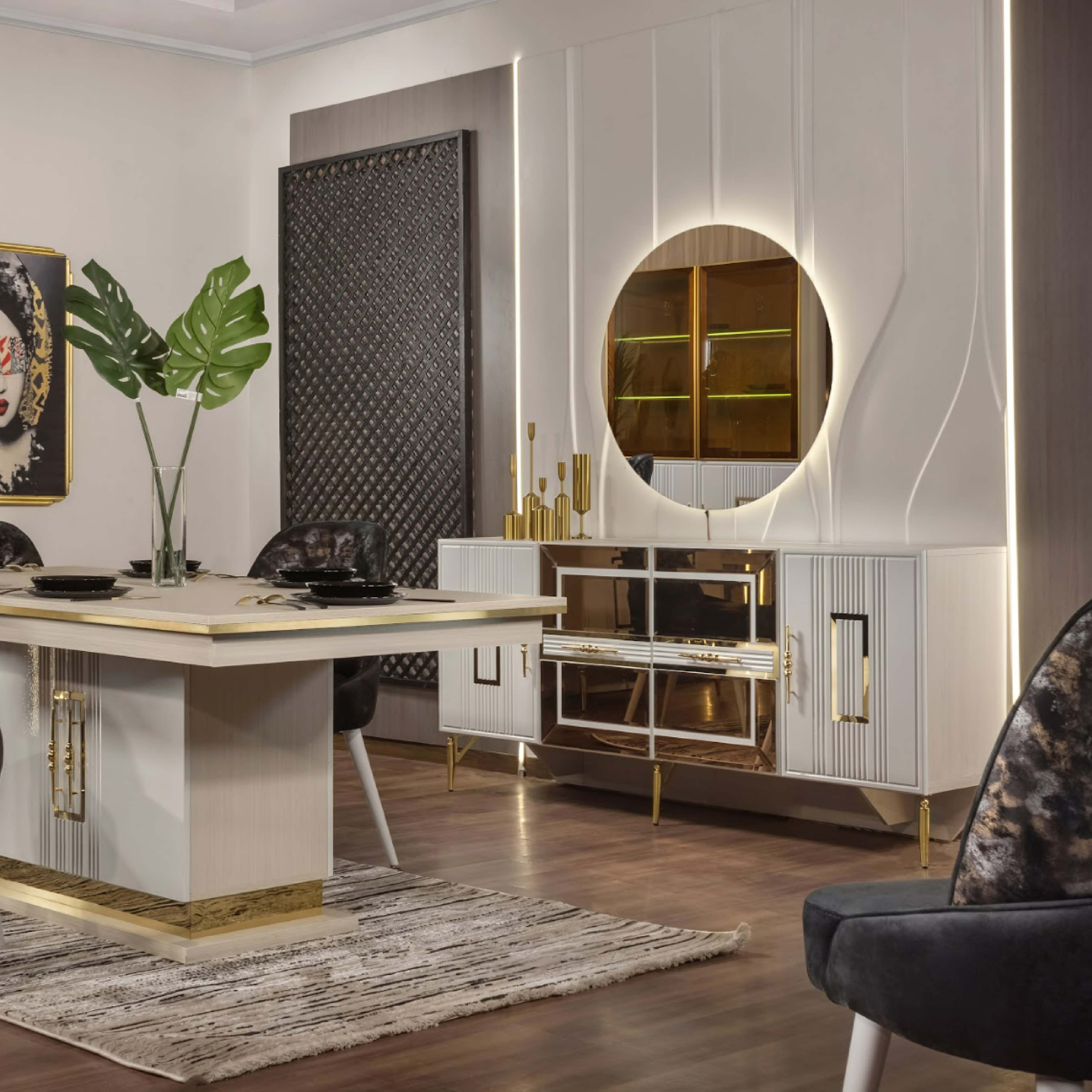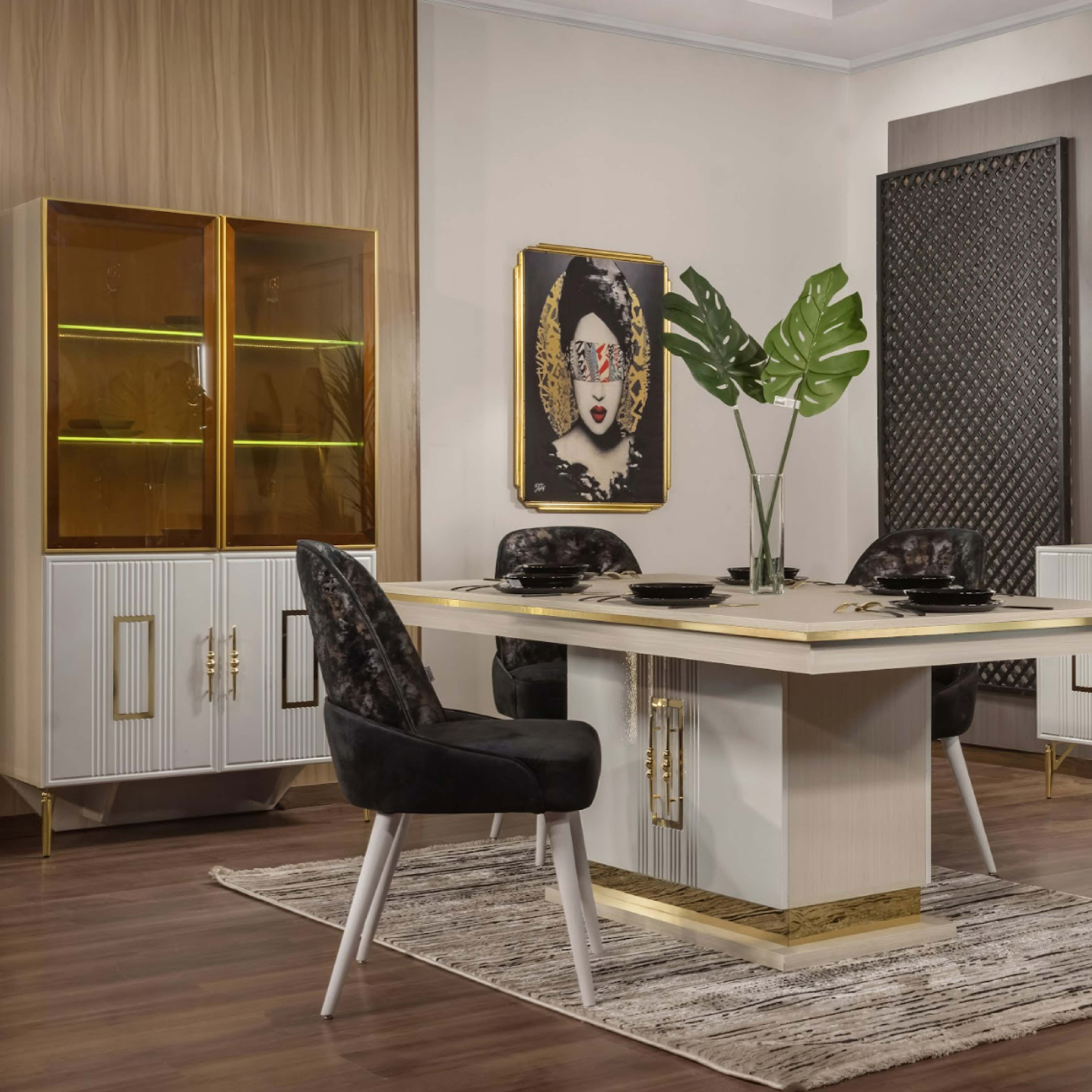 سفرة مكونة من ترابيزة + 6 كراسي + نيش + بوفيه مسطحات الغرفة خشب ام دي اف كراسي السفرة خشب زان احمر