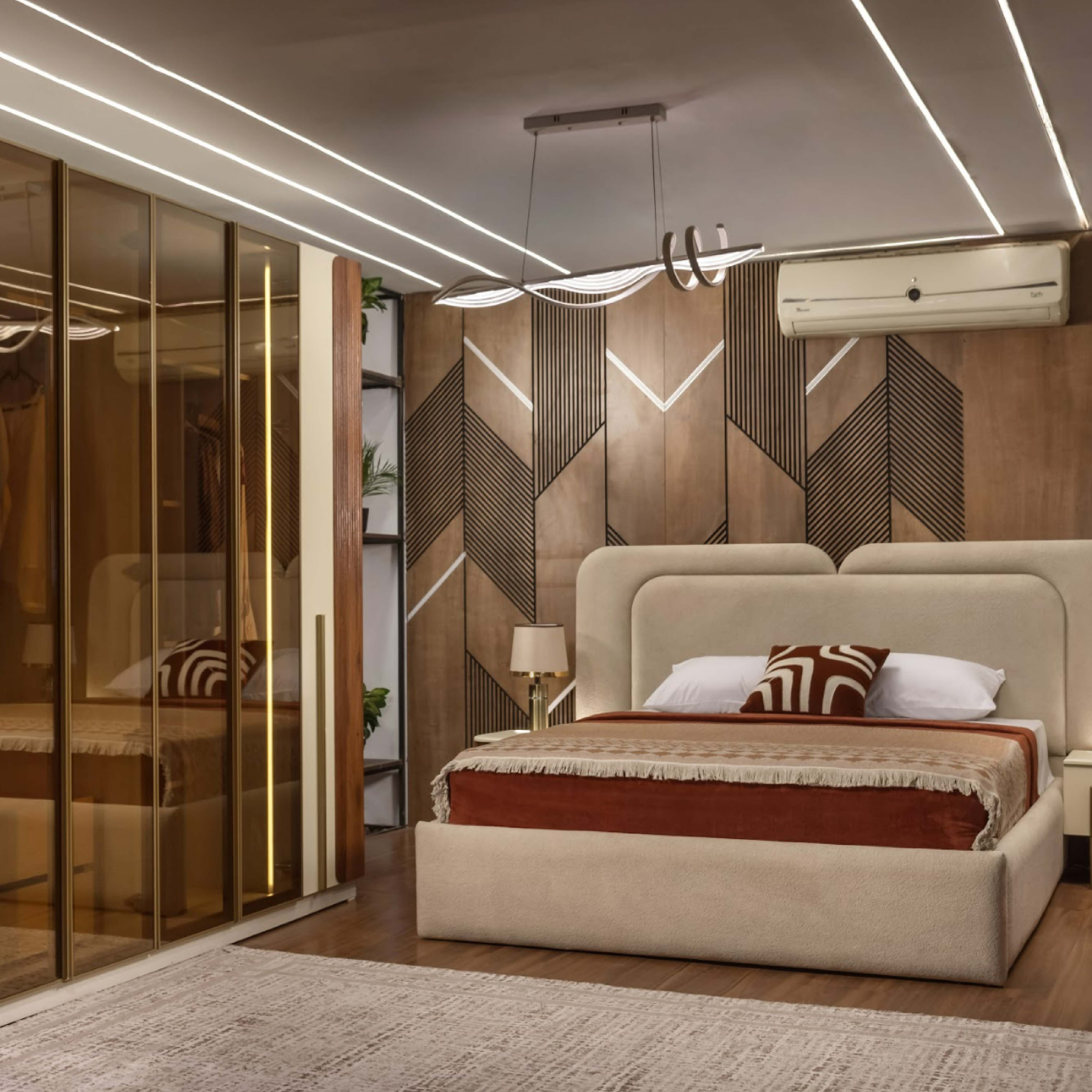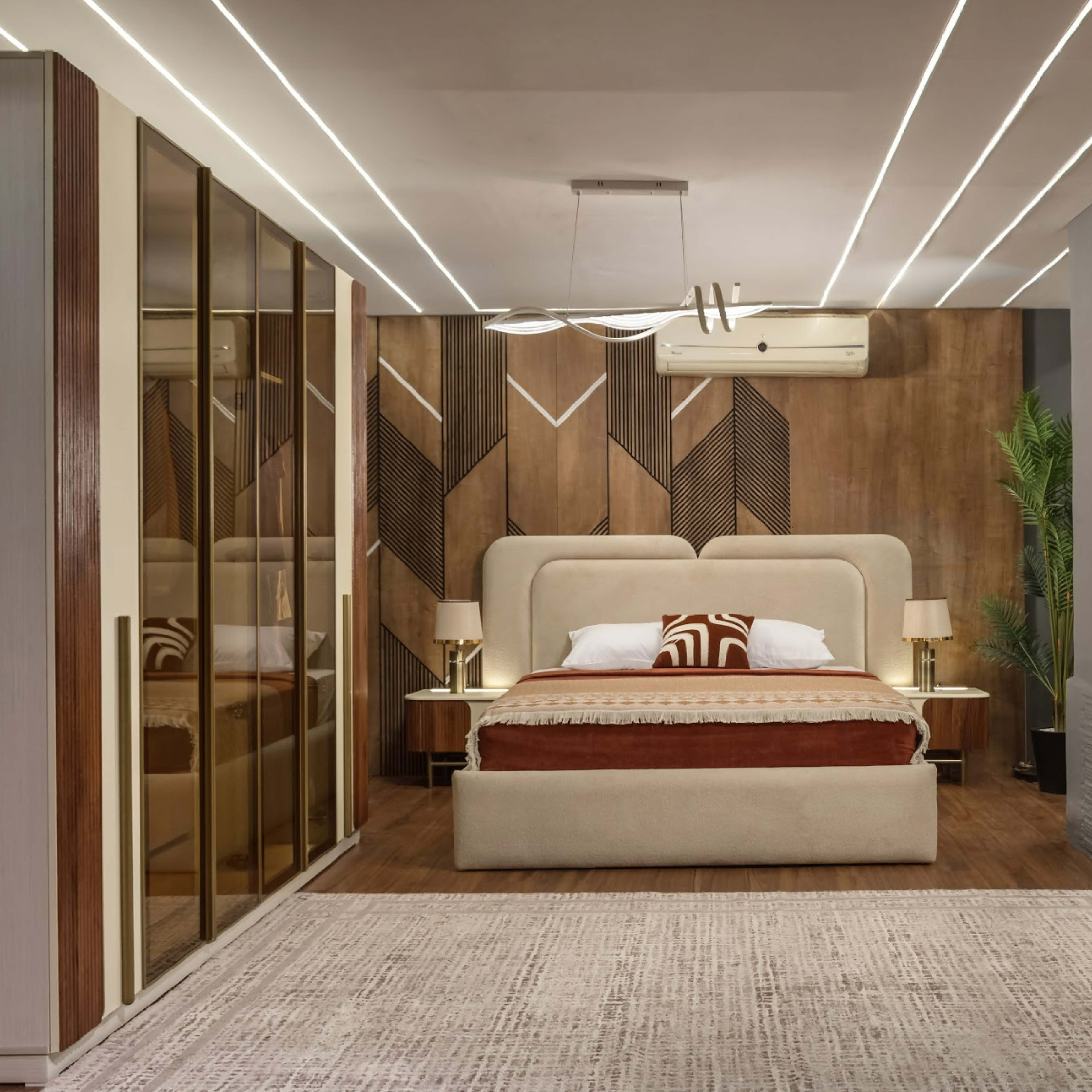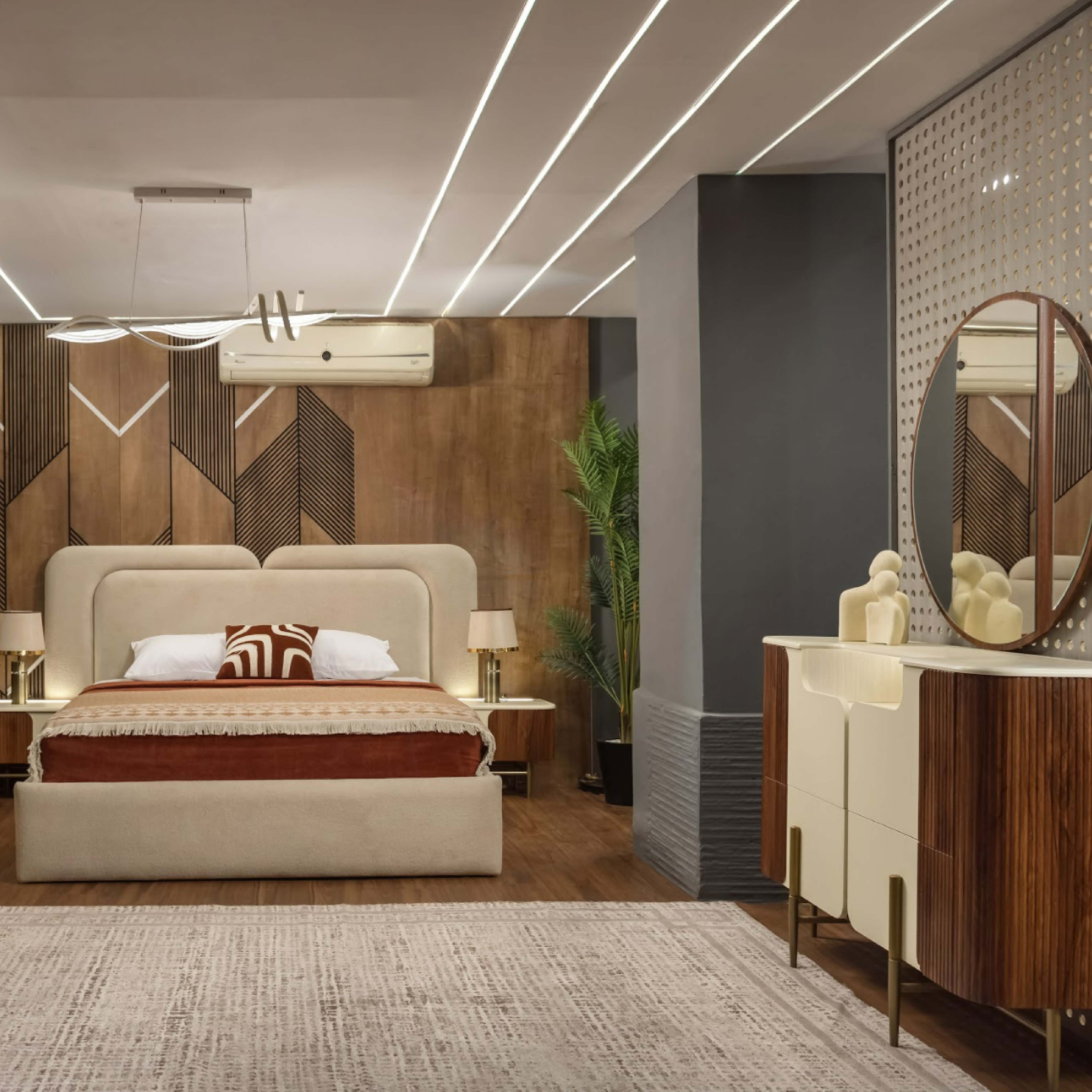غرفة نوم مكونة من سرير + ٢ كمود + تسريحة + دولاب خشب ام دي اف