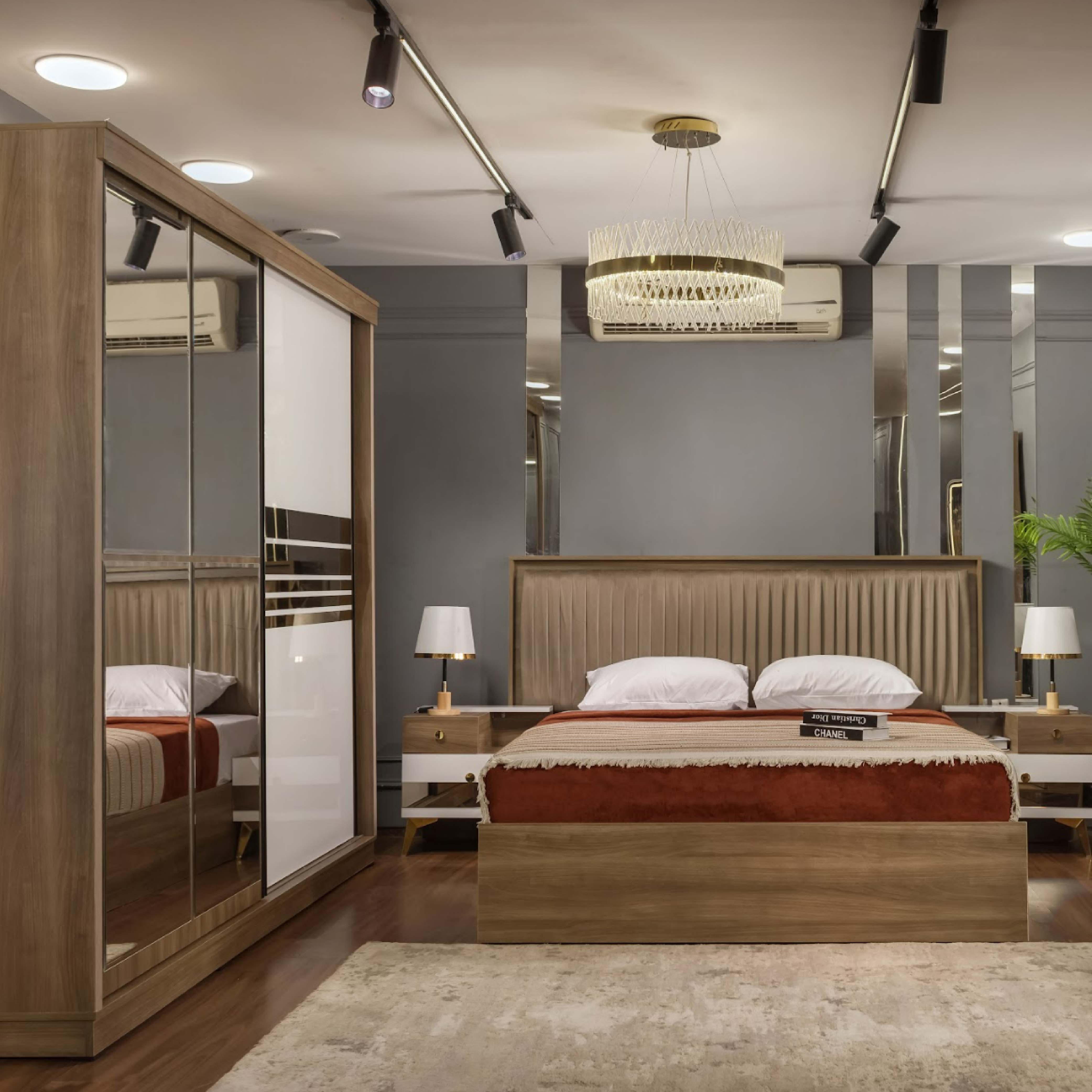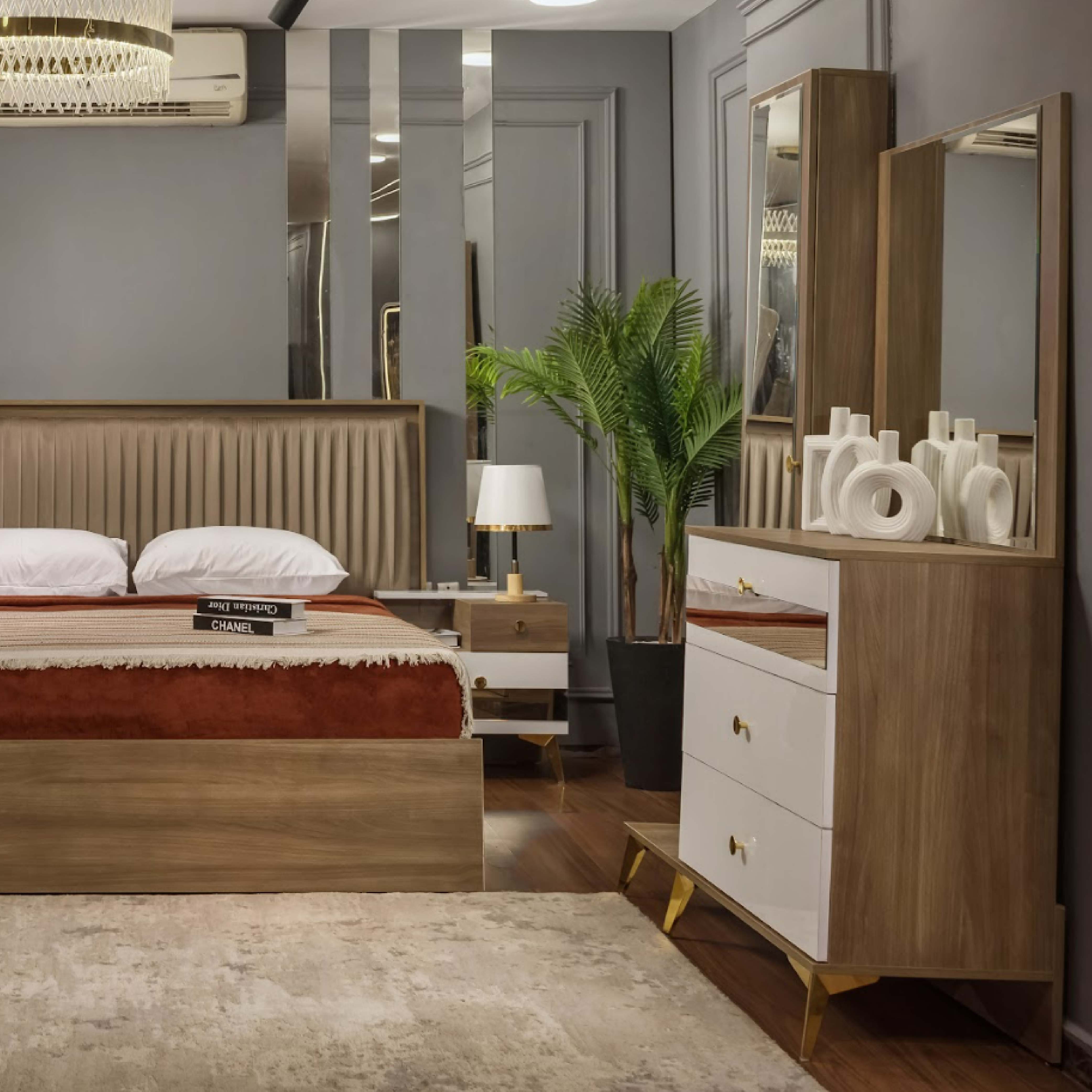 غرفة نوم مكونة من سرير + ٢ كمود + تسريحة + دولاب خشب ام دي اف
