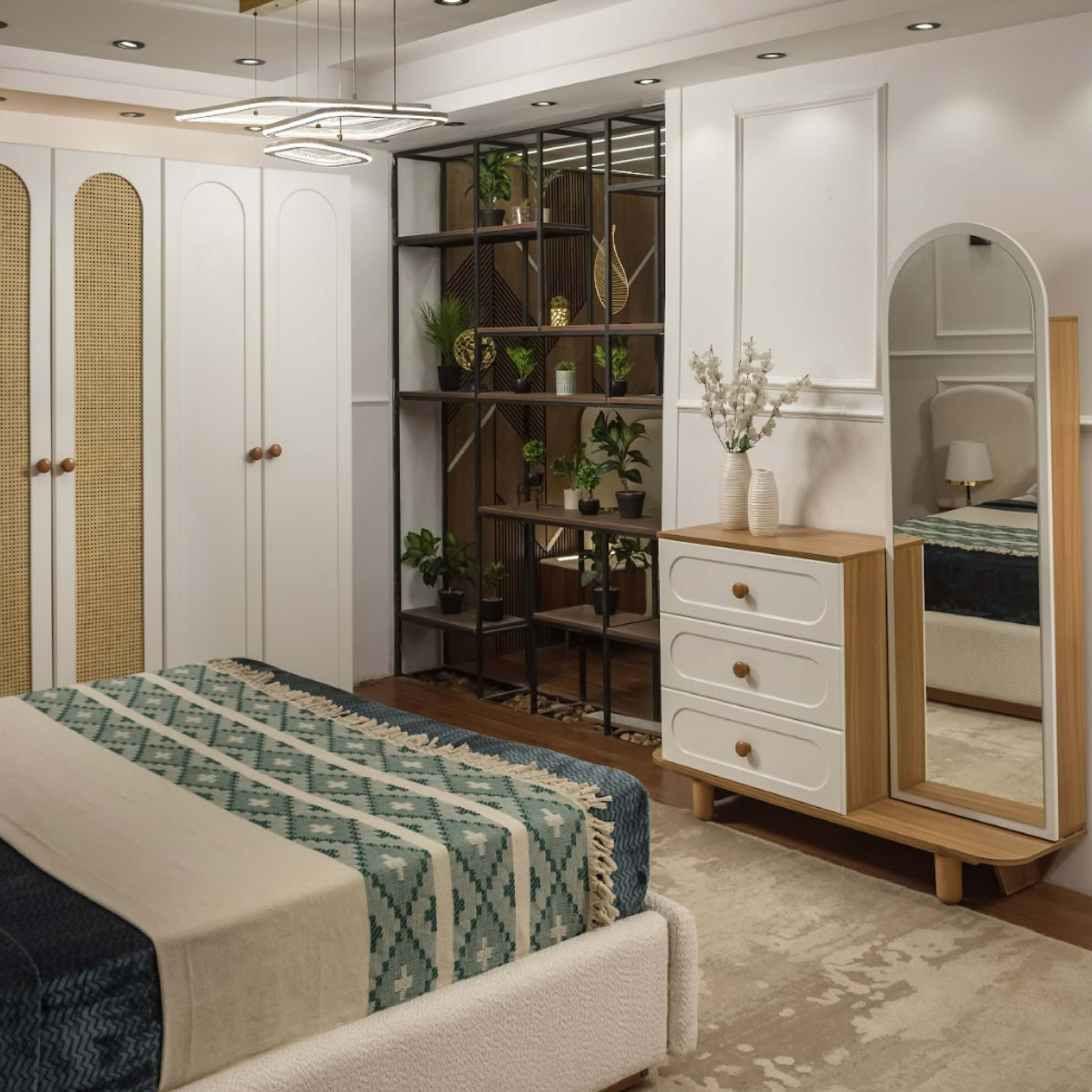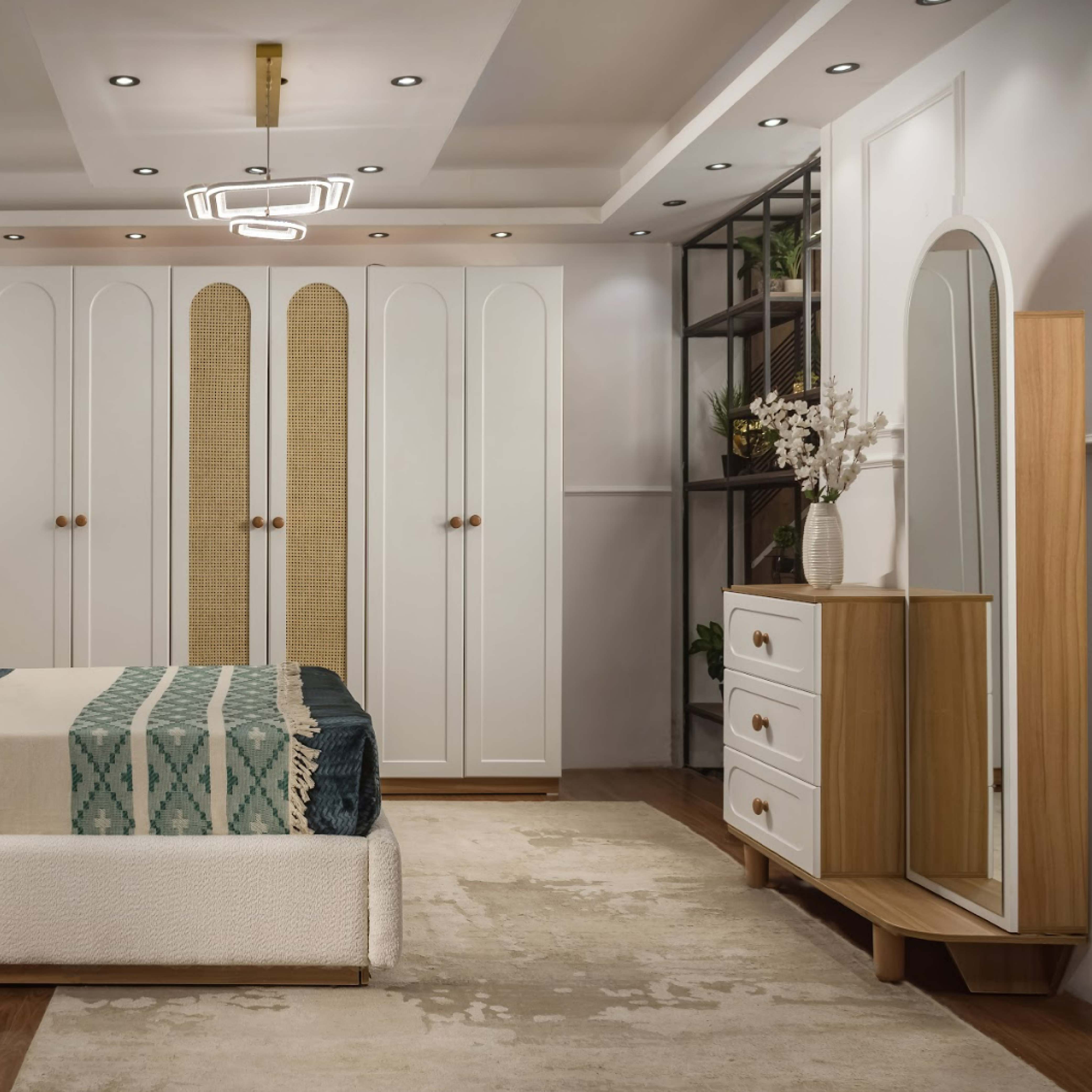 غرفة نوم مكونة من سرير + ٢ كمود + تسريحة + دولاب خشب ام دي اف